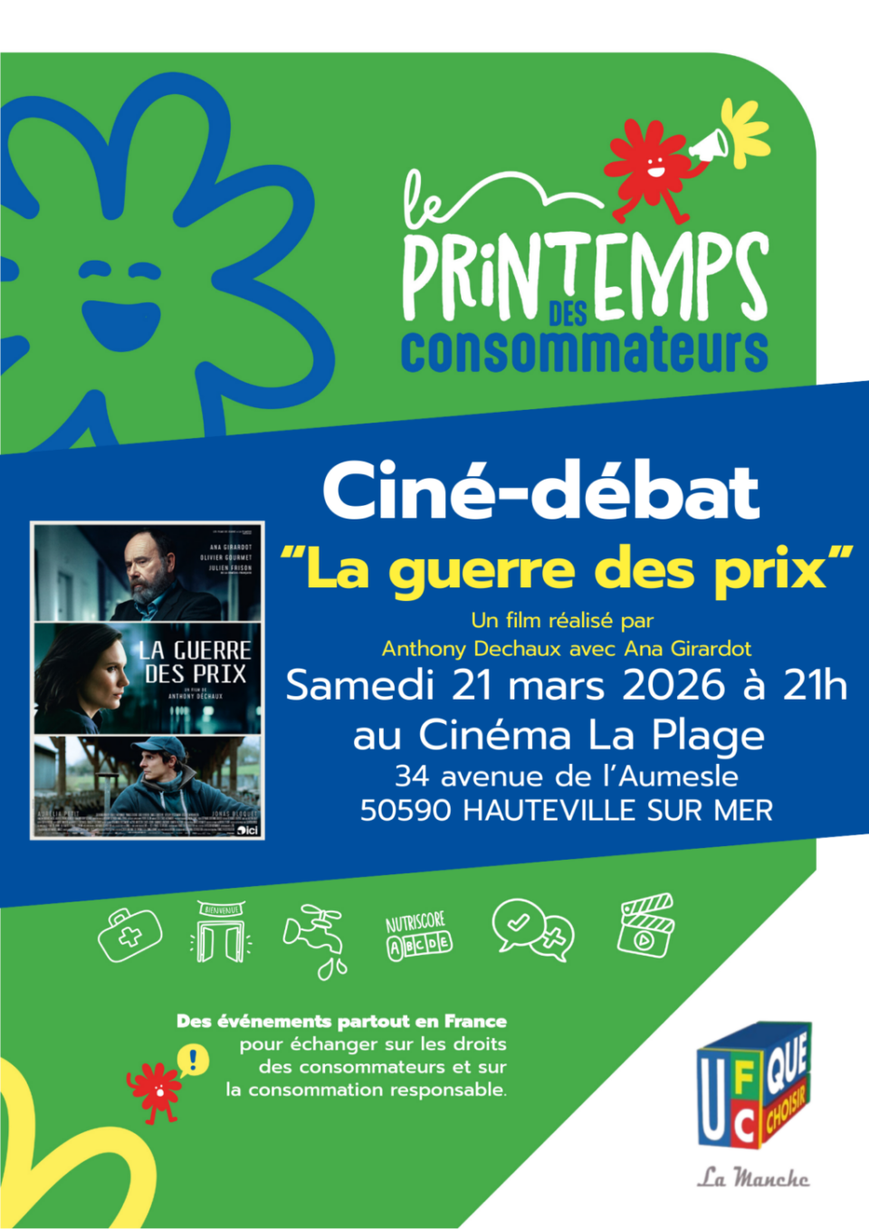 Pour inaugurer cette initiative, nous vous accueillons avec plaisir lors de notre ciné-débat à l’occasion de la sortie nationale d’un film très particulier, « La Guerre des prix » , d’Anthony Dechaux le 18 mars 2026, un véritable thriller qui mine de rien pose les bonnes questions concernant la consommation responsable, le prix juste et les difficultés que rencontrent en 2026 les filière d’alimentation saines, le jeu trouble des grandes surfaces et industriels de l’agro-alimentaire au détriment des consommateurs et des agriculteurs.
